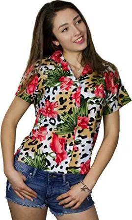 Funky Hawaii-Bluse-Hemd, Damen, Kurzarm, Leopard-Flowers, Beige-Natural, L