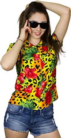 Funky Hawaii-Bluse-Hemd, Damen, Kurzarm, Leopard-Flowers, Gelb, XXL