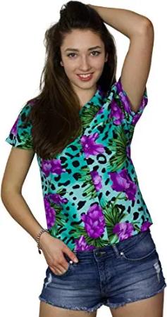 Funky Hawaii-Bluse-Hemd, Damen, Kurzarm, Leopard-Flowers, Türkis, XL