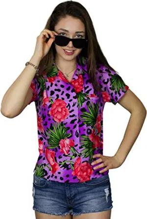 Funky Hawaii-Bluse-Hemd, Damen, Kurzarm, Leopard-Flowers, Violett, S