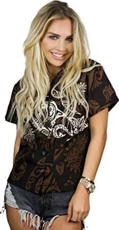 Funky Hawaii-Bluse-Hemd, Damen, Kurzarm, Maori-Chest, Braun, XS