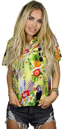 Funky Hawaii-Bluse-Hemd, Damen, Kurzarm, Parrot-Cockatoo, Hell-Gelb, L