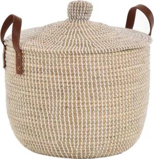 Handgearbeiteter Seegras Dekokorb mit Deckel zur Aufbewahrung Flechtkorb Korb Natur mit weißen Wicklungen Rund (Hell Natur, Rund mit Deckel Groß Ø44cm)