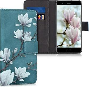 Wallet Case kompatibel mit Huawei P10 Lite Hülle - Cover mit Ständer und Kartenfächern - Magnolien Taupe Weiß Blaugrau