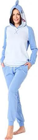 Damen Schlafanzug Zweiteiler Langarm Tierkostüm bunt Tiermotiv Verkleidung mit Kapuze LA40-238 (Blau Hai, S)