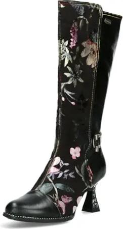Damen Stiefel Leder Langschaft Blumen Zierriemen Cap Toe Oliveo 02, Größe:39 EU, Farbe:Schwarz