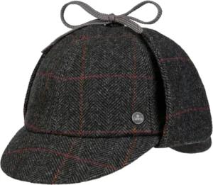 Deerstalker Check Cap Klassische Jagdmütze Wollcap mit Ohrenklappen Herren Made in Germany Herbst/Winter schwarz-grau 60 cm