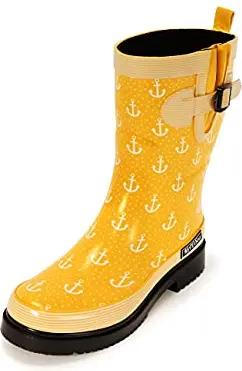 Damen Gummistiefel Ocean Anchor Halbschaft | Regenstiefel wasserdicht mit Dehnfalte Gartenschuh mit Anker Motiv , Gelb mit Weißen Ankern, 36 EU