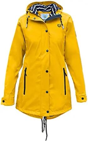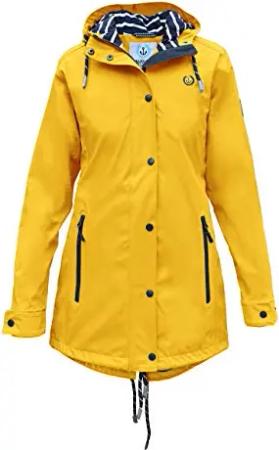 Damen Regenmantel Friesennerz 62087 | halblanger wasserdichter Regenparka | winddicht mit maritimen, weiß/blauen Innenfutter | Kapuze Außentaschen mit Reißverschluss, currygelb, 50
