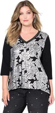 Damen große Größen Übergrößen Plus Size T-Shirt, A-Linie, silbernes Rosenmuster schwarz 48 836032100-48