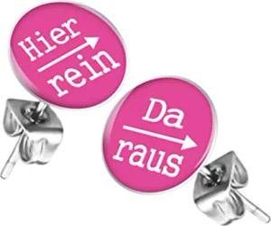 Ohrstecker Studs Buttons Silber Platte mit Spruch "Hier rein, Da raus" - 12mm in Pink