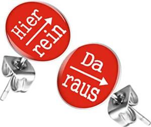 Ohrstecker Studs Buttons Silber Platte mit Spruch "Hier rein, Da raus" - 12mm in Rot