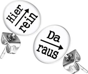 Ohrstecker Studs Buttons Silber Platte mit Spruch "Hier rein, Da raus" - 12mm in Weiß