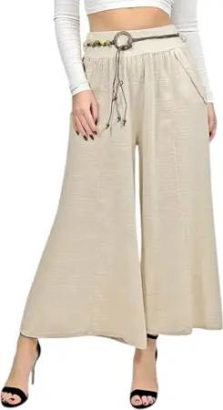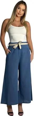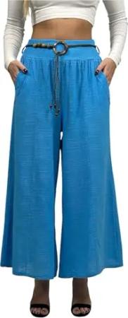 385 Damen Vielseitige Boho-Chic Hose 100% Baumwolle mit Stoffgürtel, Jeansblau