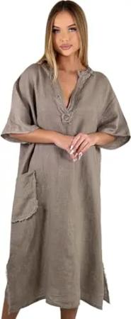 100% Leinen Kleid Damen mit V-Ausschnitt & Tasche 3093 - Leinenkleid Fango