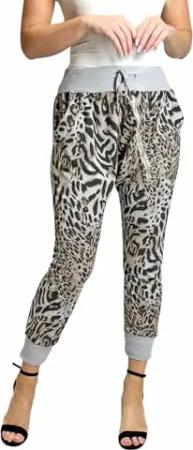 129 Damen Hose Sweatpants Jogginghose Baumwolle Freizeithose Leo Print Tierprint Haremshose mit Gummibund Reißverschluss Hellgrau