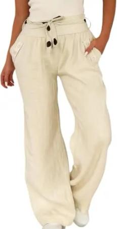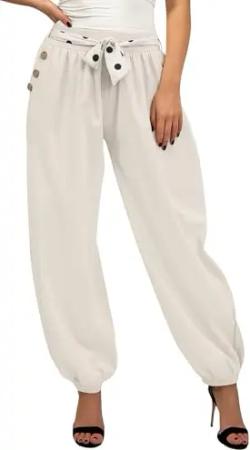 282 Damen Leinenhose lockere Freizeithose Lange 100% Leinen Hose Uni Stoffhose Elegante Haremshose mit Knöpfen einfarbig Weiß M