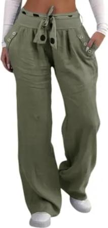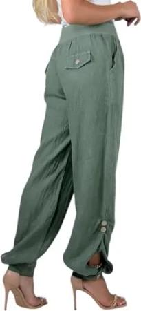 282 Damen Leinenhose lockere Freizeithose Lange 100% Leinen Hose Uni Stoffhose Elegante Haremshose mit Knöpfen einfarbig Oliv M