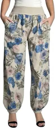 277 Damen leichte Blumenprint Hose Sommerhose Haremshose Ballonhose Blumen Pumphose Aladinhose Sommer Baggy Pants Beige