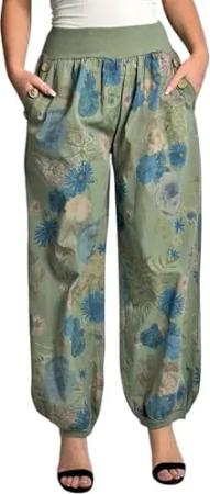 277 Damen leichte Blumenprint Hose Sommerhose Haremshose Ballonhose Blumen Pumphose Aladinhose Sommer Baggy Pants Oliv
