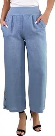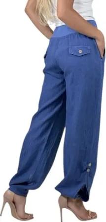 319 Damen Leinenhose lockere Freizeithose 7/8 Lange Hose mit DREI Knöpfe 100% Leinen Jeansblau