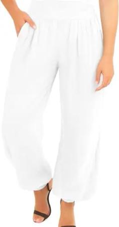 282 Damen Leinenhose lockere Freizeithose Lange 100% Leinen Hose Uni Stoffhose Elegante Haremshose mit Knöpfen einfarbig Weiß XXL