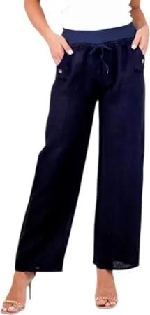 298 Damen Leinenhose lockere Freizeithose Lange 100% Leinen Hose Uni Elegante Stoffhose Haremshose Dunkelblau L