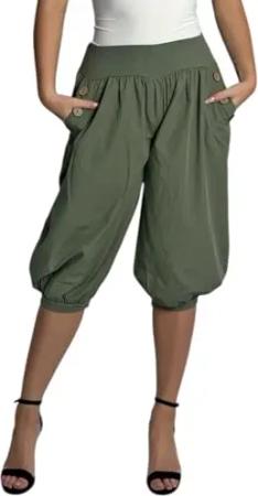 371 Caprihosen Damen Hose Capri Freizeithose Baggy Haremshose Baumwolle Olive