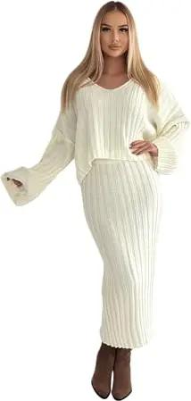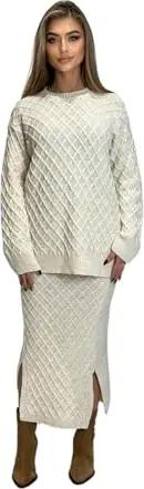 379 Damen Strickset mit Pullover Rock Strickpullover Strickrock Creme