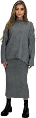 395 Damen Strickset mit Pullover Rock Strickpullover Strickrock Grau