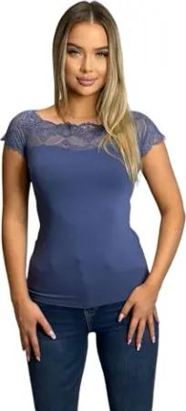 71 Damen Spitzenshirt Spitze Spitzen T-Shirt Bluse Shirt Langarmshirt Kurzarmshirt Blau/Kurzarm