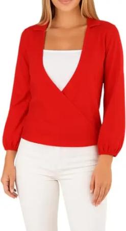 Amri Damen Wickelbluse Bluse 3/4 arm Tunika Longshirt mit Stehkragen Shirt Rot M