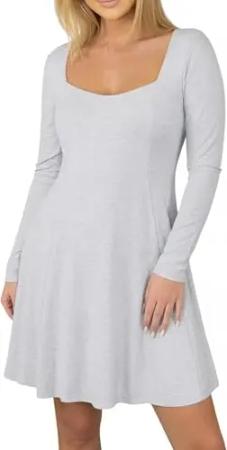 Jess Damen Jersey Kleid Skaterkleid Knielang Karree-Ausschnitt Langarm Top Grau M