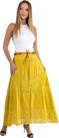 Langer Baumwollrock mit Spitze & Gürtel 3094 Gelb