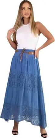 Langer Baumwollrock mit Spitze & Gürtel 3094 Jeansblau