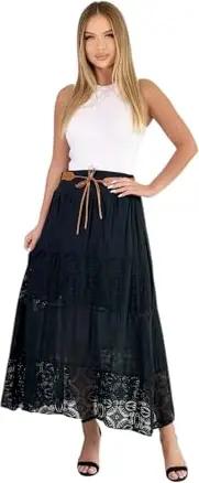 Langer Baumwollrock mit Spitze & Gürtel 3094 Schwarz