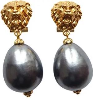 Auffällig: Sehr große leichte Ohr-Clips Löwenkopf vergoldet Anhänger Perle grau Tropfen Geschenk stilvoll Geschenk Statement elegant Designer JUSTWIN