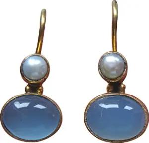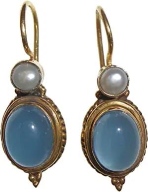 Kleine Chalzedon-Ohrringe blau leuchtend echte Süßwasser-Perle Hänger verschließbar Silber vergoldet leicht Handarbeit Unikat Italien Retro Geschenk klassisch