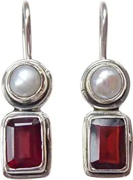 Eckige Granat-Ohrringe rot echte Süßwasser-Perle Hänger Haken verschließbar Silber Retro Vintage Unikat Handarbeit Italien leicht Geschenk