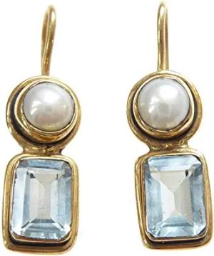 Stilvolle Topas-Ohrringe Topaz blau echte Süßwasser-Perle Hänger Haken verschließbar Silber vergoldet Retro Vintage Unikat Handarbeit aus Italien