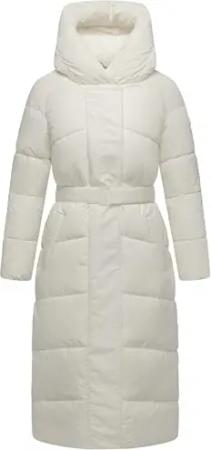 Damen Langer Wintermantel warmer Steppmantel mit Kapuze und Taillengürtel Herbstnebel 14 Off White Gr. L
