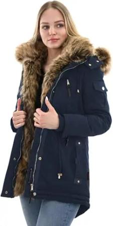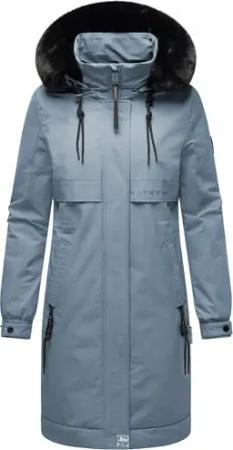 Damen Mantel lange warme Winterjacke mit Kunstfell und Kapuze (beides abnehmbar) Kaltwetterretter 14 Stormy Blue Gr. S