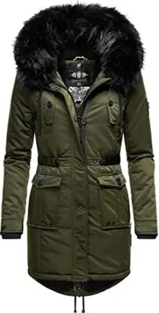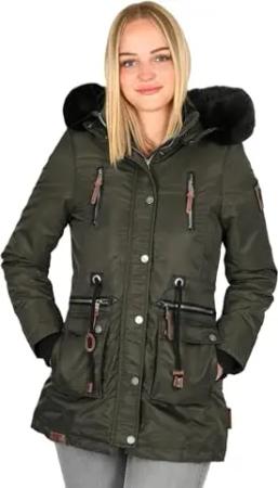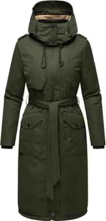 Damen Wintermantel warmer Parka mit abnehmbarer Kapuze und Taillengürtel Frostkuss 14 Dark Olive Gr. XL