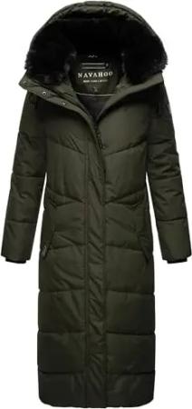 Damen Wintermantel warmer Steppmantel lang mit abnehmbarer Kunstfell-Kapuze Paula Dark Olive Gr. XS