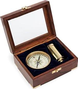 Marine-Set Kompass und Teleskop aus Messing in der Holzbox mit Glasdeckel 11685