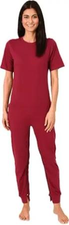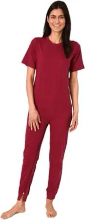 Damen Pflegeoverall Kurzarm Einteiler Schlafanzug mit Reißverschluss am Rücken, Farbe:Beere, Größe:XXL