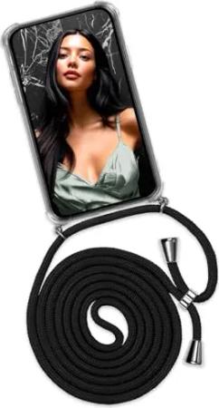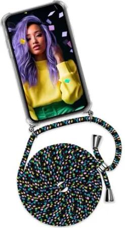 Handykette für iPhone 16 Hülle mit Band, Handyhülle mit Kette abnehmbar, Handyband zum Umhängen, Handy Umhängeband Lange Handykordel, Twist Case – Schwarz Bunt