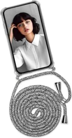 Handykette für Samsung Galaxy S21 Hülle mit Band, Handyhülle mit Kette abnehmbar, Handyband zum Umhängen, Handy Umhängeband Lange Handykordel, Twist Case – Grau Weiß