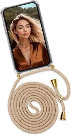 Handykette für iPhone 16 Hülle mit Band, Handyhülle mit Kette abnehmbar, Handyband zum Umhängen, Handy Umhängeband Lange Handykordel, Twist Case – Gold Beige