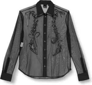 Damen Gestickte Satinhemd Chips Bluse, Zdg_Schwarz/Butter, 34